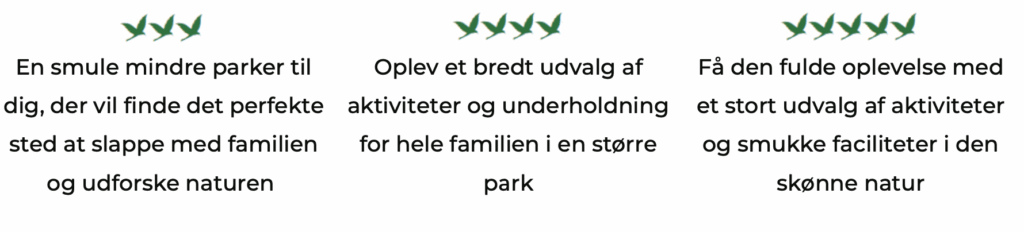 Fælles for parkerne er, at de alle er omgivet af smuk natur samt har adgang til badelandet Aqua Mundo.
